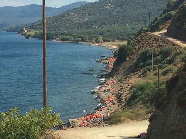 Most of the boats arrive north of the island between Eftalou and Sikamias where the beaches are shallow and the boats can beach easily. Numerous dinghies, life vests and empty water bottles are stacked up on the beaches. The refugees are, more often than not, in wet clothing, frozen, hungry and exhausted.The Boat Refugee Foundation Netherlands, based in Eftalou, with the assistance of volunteers, provides the initial basic care. This is how the refugees get water, fresh fruit, dry clothing, and if necessary, medical care.